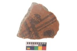 | Description / विवरण | Specimen of black on red ware with black decorative Lines intersecting eachother with broad dots geometric painting. |