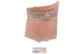 | Description / विवरण | Specimen of black on red ware with black decorative Lattice leaf between lines geometric painting. |