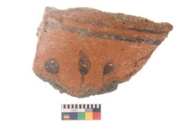 | Description / विवरण | Specimen of black on red ware with black decorative Horizontal lines and floral design geometric and nature painting. |