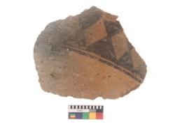 | Description / विवरण | Specimen of black on red ware with black decorative Broad double axe like design and horizontal lines geometric painting. |