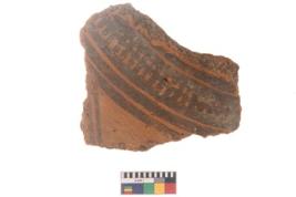 | Description / विवरण | Specimen of black on red ware with black decorative Parallel horizontal lines and square lattice design geometric painting. |