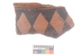 | Description / विवरण | Specimen of black on red ware with black decorative Broad diamond lattice geometric painting. |