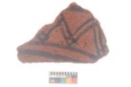 | Description / विवरण | Specimen of black on red ware with black decorative Joint triangles in between two parallel lines geometric painting. |