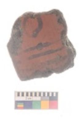 | Description / विवरण | Specimen of black on red ware with black decorative Circle between lines geometric painting. |