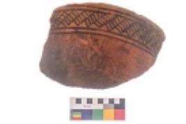 | Description / विवरण | Specimen of black on red ware with black decorative Lattice design in between two horizontal lines geometric painting. |