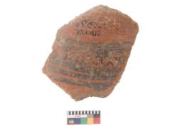 | Description / विवरण | Specimen of black on red ware with black decorative Joint curved lines in between horizontal lines geometric painting. |