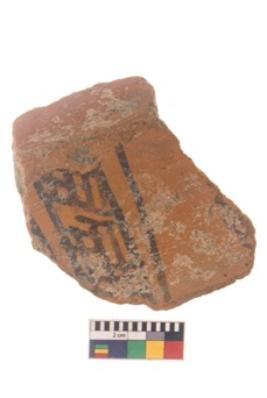 | Description / विवरण | Specimen of black on red ware with black decorative Lattice design geometric painting. |
