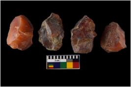 | Description / विवरण | Specimen of a cores with several broad fluted marks. The reverse bulb and platform can be seen. The flake scars are seen on all sides |