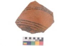 | Description / विवरण | Specimen of black on red ware with black decorative Group of horizontal lines geometric painting. |