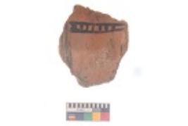 | Description / विवरण | Specimen of black on red ware with black decorative Lattice leaf geometric painting. |