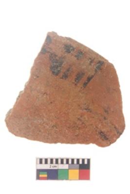 | Description / विवरण | Specimen of black on red ware with black decorative Vertical lines intersceting horizontal lines geometric painting. |
