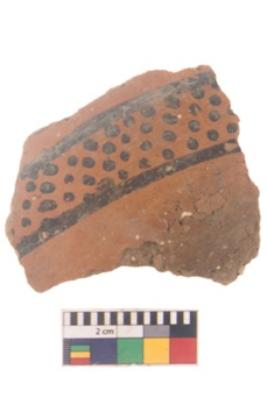 | Description / विवरण | Specimen of black on red ware with black decorative Dots in between horizontal lines geometric painting. |