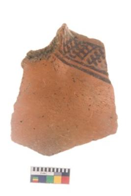 | Description / विवरण | Specimen of black on red ware with black decorative Leaf like design nature painting. |