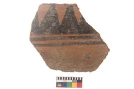 | Description / विवरण | Specimen of black on red ware with black decorative Group of vertical triangles between lines geometric painting. |