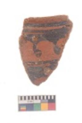 | Description / विवरण | Specimen of black on red ware with black decorative Band of arch like design and a suspended loop with a circle on the right geometric painting. |