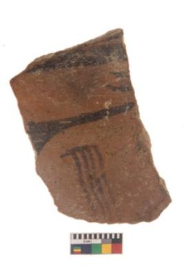 | Description / विवरण | Specimen of black on red ware with black decorative Wavy like design and floral design geometric and nature painting. |