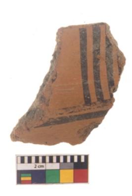 | Description / विवरण | Specimen of black on red ware with black decorative Vertical lines intersecting horizontal lines geometric painting. |