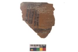 | Description / विवरण | Specimen of black on red ware with black decorative Vertical lines intersecting horizontal lines geometric painting. |