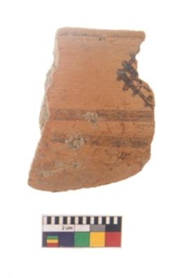 | Description / विवरण | Specimen of black on red ware with black decorative Lines intersecting eachother geometric painting. |