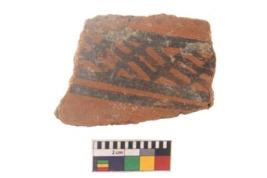 | Description / विवरण | Specimen of black on red ware with black decorative Lattice design geometric painting. |