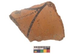 | Description / विवरण | Specimen of black on red ware with black decorative Curved lines intersecting eachother and dots geometric painting. |
