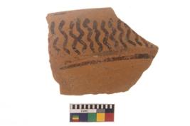 | Description / विवरण | Specimen of black on red ware with black decorative Zigzag lines geometric painting. |