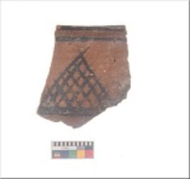 | Description / विवरण | Specimen of black on red ware with black decorative Lattice in between horizontal lines geometric painting. |