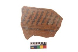 | Description / विवरण | Specimen of black on red ware with black decorative Vertical lines and row of arcs with short vertical strokes geometric painting. |