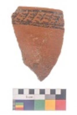 | Description / विवरण | Specimen of black on red ware with black decorative Small vertical lines between parallel lines geometric painting. |