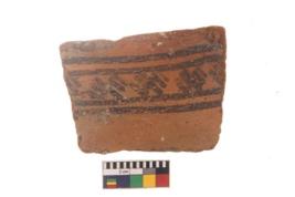 | Description / विवरण | Specimen of black on red ware with black decorative Horizontal lines and leaf like design geometric and nature painting. |