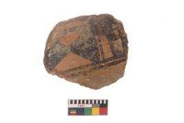 | Description / विवरण | Specimen of black on red ware with black decorative Broad double axe like design geometric painting. |