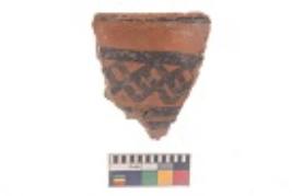 | Description / विवरण | Specimen of black on red ware with black decorative Lattice pattern geometric painting. |