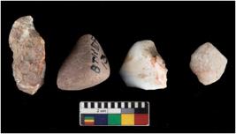 | Description / विवरण | There are n-4 cores. There are irregular scar pattern. Surface are smooth. Edges are blunt and round. Tapering can be seen on them. There is one chert and other are chalcedony. |