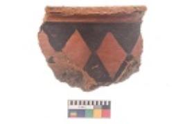 | Description / विवरण | Specimen of black on red ware with black decorative Broad vertical double axe like design geometric painting. |