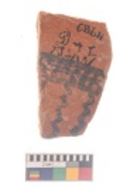 | Description / विवरण | Specimen of black on red ware with black decorative Lattice and wavy design geometric painting. |