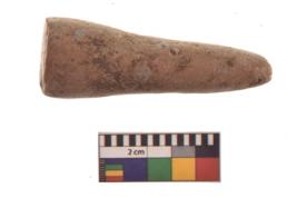 | Description / विवरण | Specimen of a Terracotta Pendant. It is made of red ware, fine fabric, well-fired. It is cylindrical in shape with tapering upwards. The base of this object is flat. |