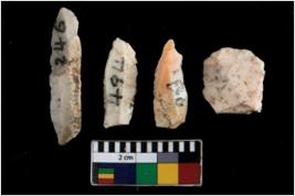 | Description / विवरण | There are n 4 worked utilised cores; Three can be characterised as blade cores, all are having sharp edges. Three are tapering at one end. |
