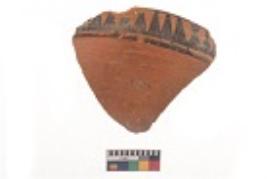 | Description / विवरण | Specimen of black on red ware with black decorative Group of elongated triangles geometric painting. |