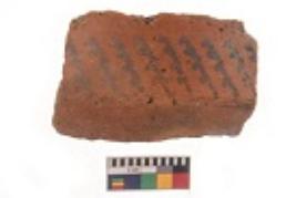 | Description / विवरण | Specimen of black on red ware with black decorative Vertical linesand row of arcs with short vertical strokes geometric painting. |