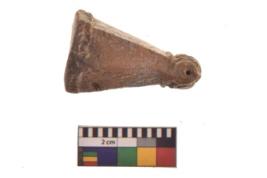 | Description / विवरण | Specimen of a Terracotta Pendant. It is made of red ware, fine fabric, well-fired. It is triangular in shape with rectangular cross section. The base of this object is flat and the hole for suspension is provided near the top. |