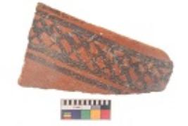| Description / विवरण | Specimen of black on red ware with black decorative Lattice design geometric painting. |