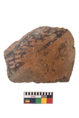 | Description / विवरण | Specimen of black on red ware with black decorative Lattice design geometric painting. |