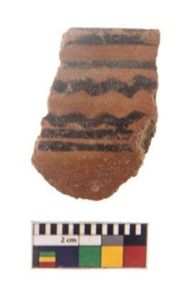 | Description / विवरण | Specimen of black on red ware with black decorative Thick wavy lines geometric painting. |