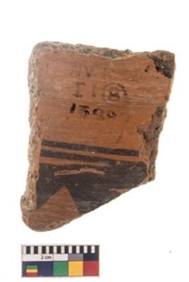 | Description / विवरण | Specimen of black on red ware with black decorative Vertical traingles geometric painting. |
