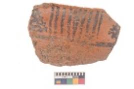 | Description / विवरण | Specimen of black on red ware with black decorative Vertical lines intersecting horizontal lines geometric painting. |