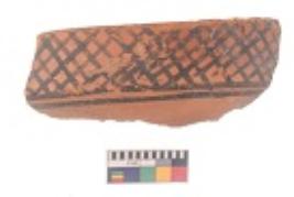 | Description / विवरण | Specimen of black on red ware with black decorative Lattice design geometric painting. |