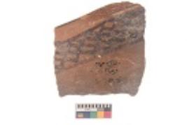 | Description / विवरण | Specimen of black on red ware with black decorative Lattice design geometric painting. |