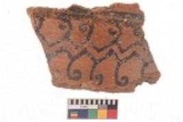 | Description / विवरण | Specimen of black on red ware with black decorative Zigzag lines and suspended loop with a circle on the right and left geometric painting. |