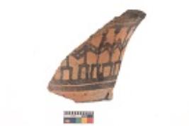 | Description / विवरण | Specimen of black on red ware with black decorative Zigzag lines and dots geometric painting. |