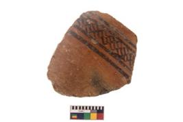 | Description / विवरण | Specimen of black on red ware with black decorative Lattice design geometric painting. |